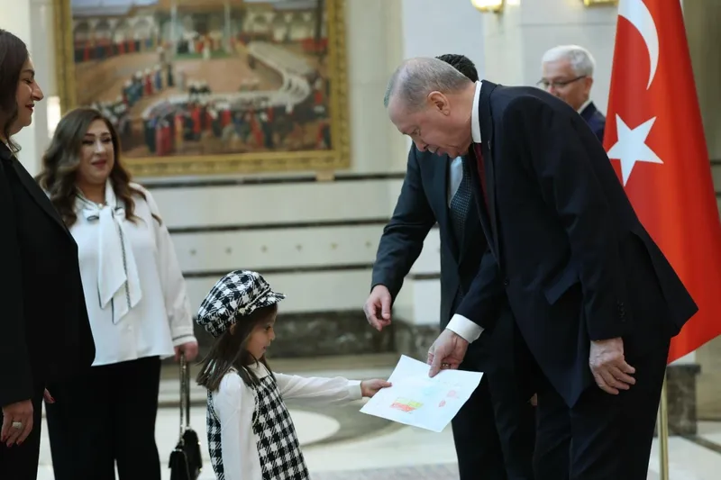 Mektup takdimi sırasında Lübnan Büyükelçisi Anuti'nin küçük kızı, Cumhurbaşkanı Erdoğan'a çizdiği resmi hediye etti. (İLKHA)