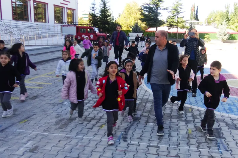 Diniye Çalık İlkokulunda düzenlenen tatbikatta, Malatya Büyükşehir Belediyesi İtfaiye Daire Başkanlığı Eğitim Amiri Muhammed Nazlı ile Büyükşehir Belediyesi Sivil Savunma Uzmanı Ahmet Köksal, olası bir deprem veya yangın durumunda öğrencilerin nasıl davranmaları gerektiği konusunda uygulamalı bilgilendirmede bulundu.