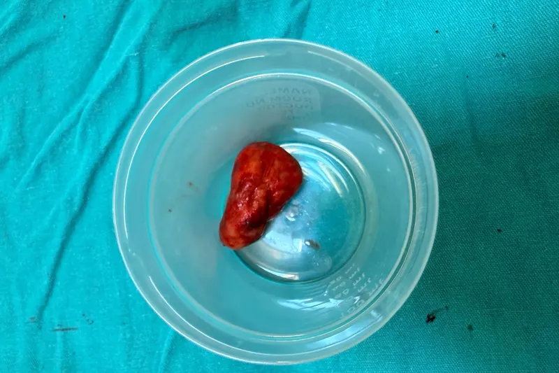 Yapılan tetkiklerde hastanın kalbinin sağ tarafında yaklaşık 4 santimetre büyüklüğünde bir kitle olduğu, ayrıca akciğer damarlarına pıhtı attığı belirlendi.