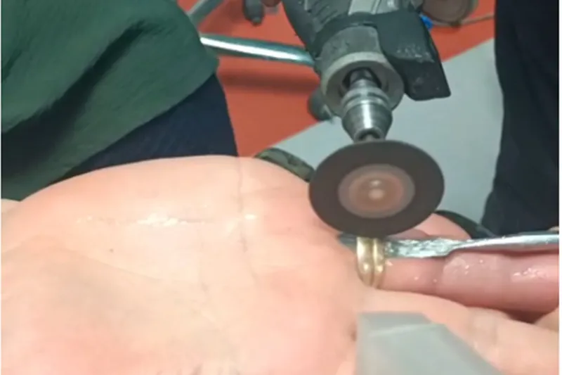 Hastaneye gelen itfaiye ekipleri, doktor kontrolü ve gözetiminde özel ekipman kullanarak sıkışan yüzüğü dikkatli bir şekilde çıkardı.