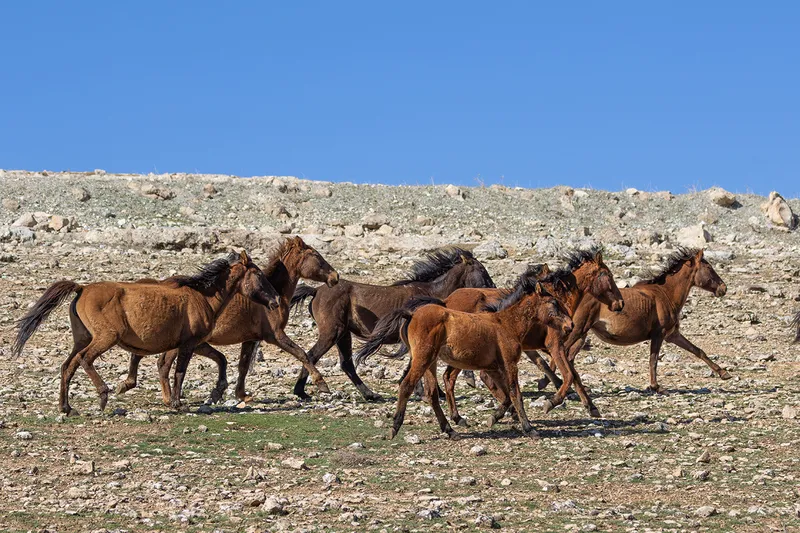 Sert iklim koşullarına dayanıklılık gösteren yılkı atları, özellikle engebeli ve geniş bozkır alanlarda sürüler halinde hareket ediyor.