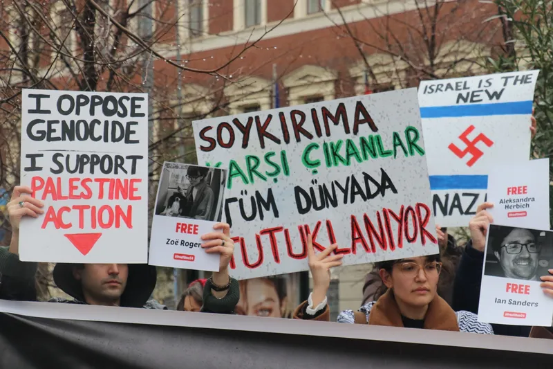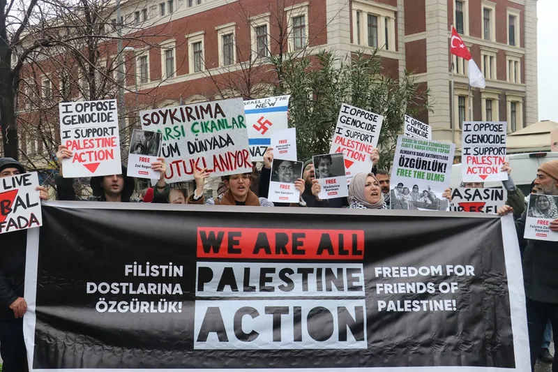 2 hafta önce İngiltere Konsolosluğu önünde eylem gerçekleştiren Filistin Davaları İnisiyatifi gönüllüleri, bu kez Beyoğlu'nda bulunan Alman Konsolosluğu önünde gerçekleştirdiği eylem ile Filistin için yaptıkları protestolar nedeniyle tutuklananların serbest bırakılması çağrısında bulundu.