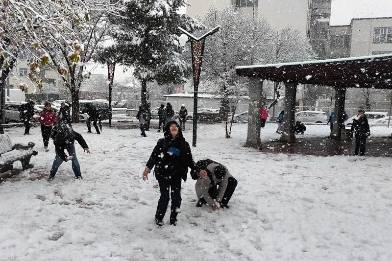 Ders zili çaldıktan sonra parklarda toplanan öğrenciler, karla kaplanan alanları oyun alanına dönüştürdü.